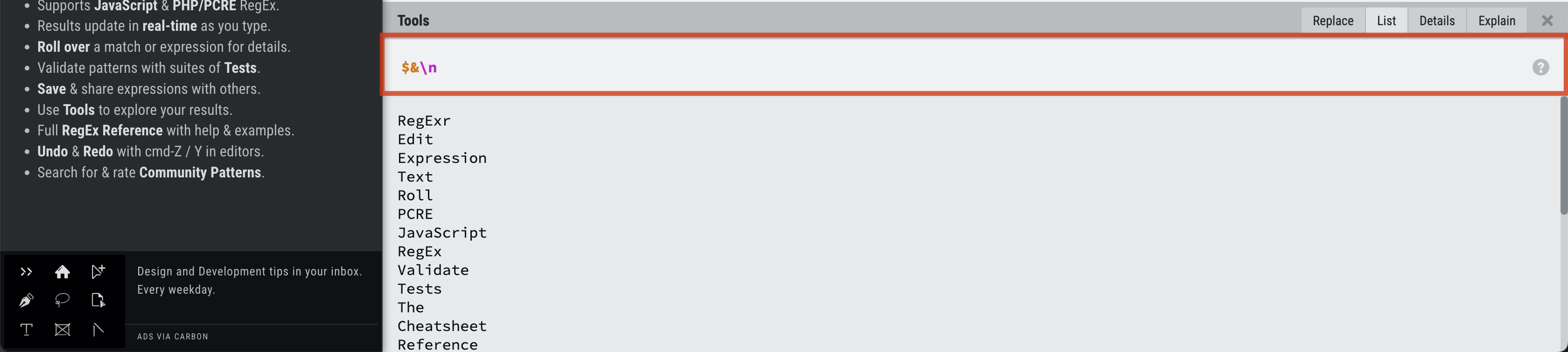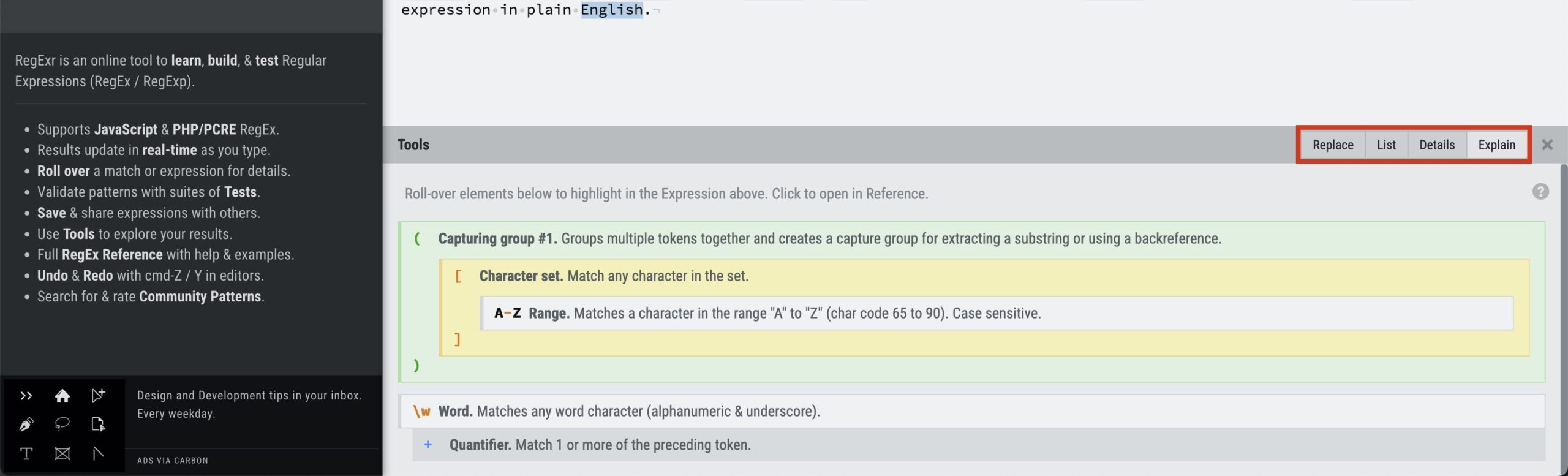 また、画面下の『Tool』欄ではいくつかモードが選べるのですが、デフォルトでは『Explain』になっており、入力した正規表現の解説をしてくれます。