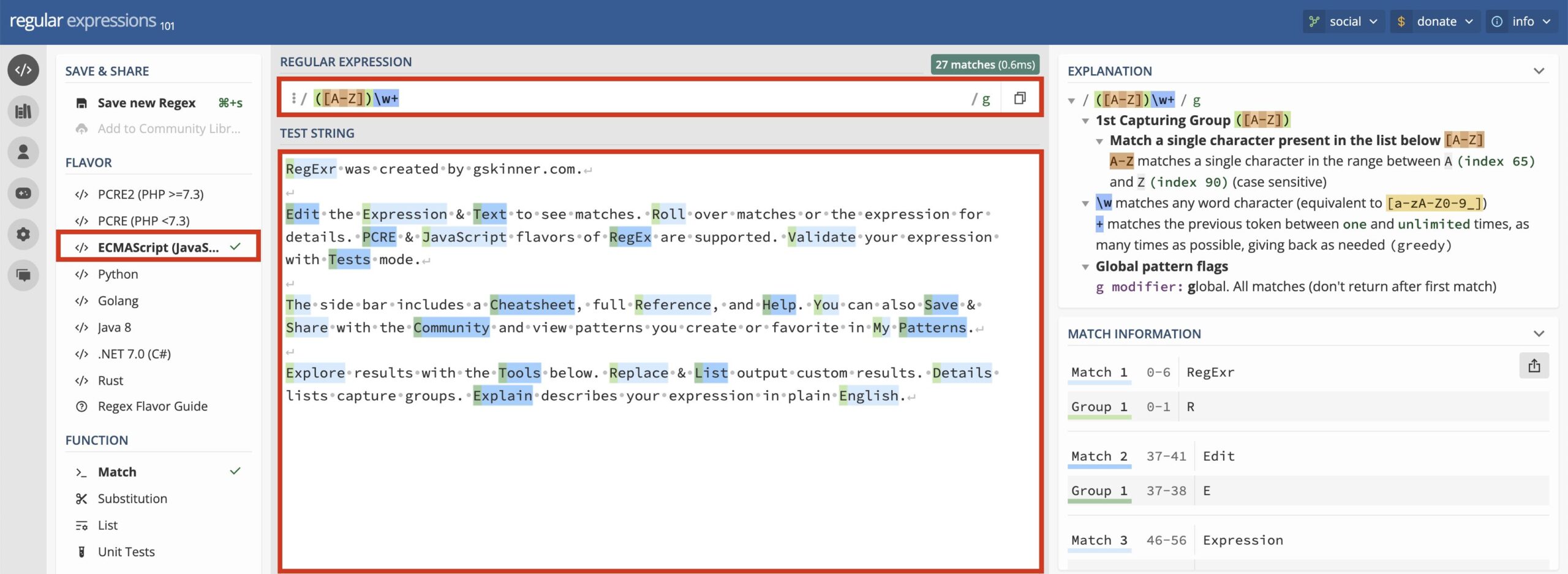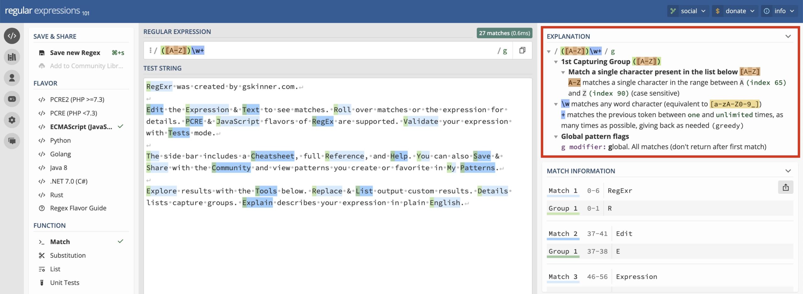 機能的にはregex101にやや劣りますが、デザインが洗練されており、使用方法も視覚的にわかりやすいです。