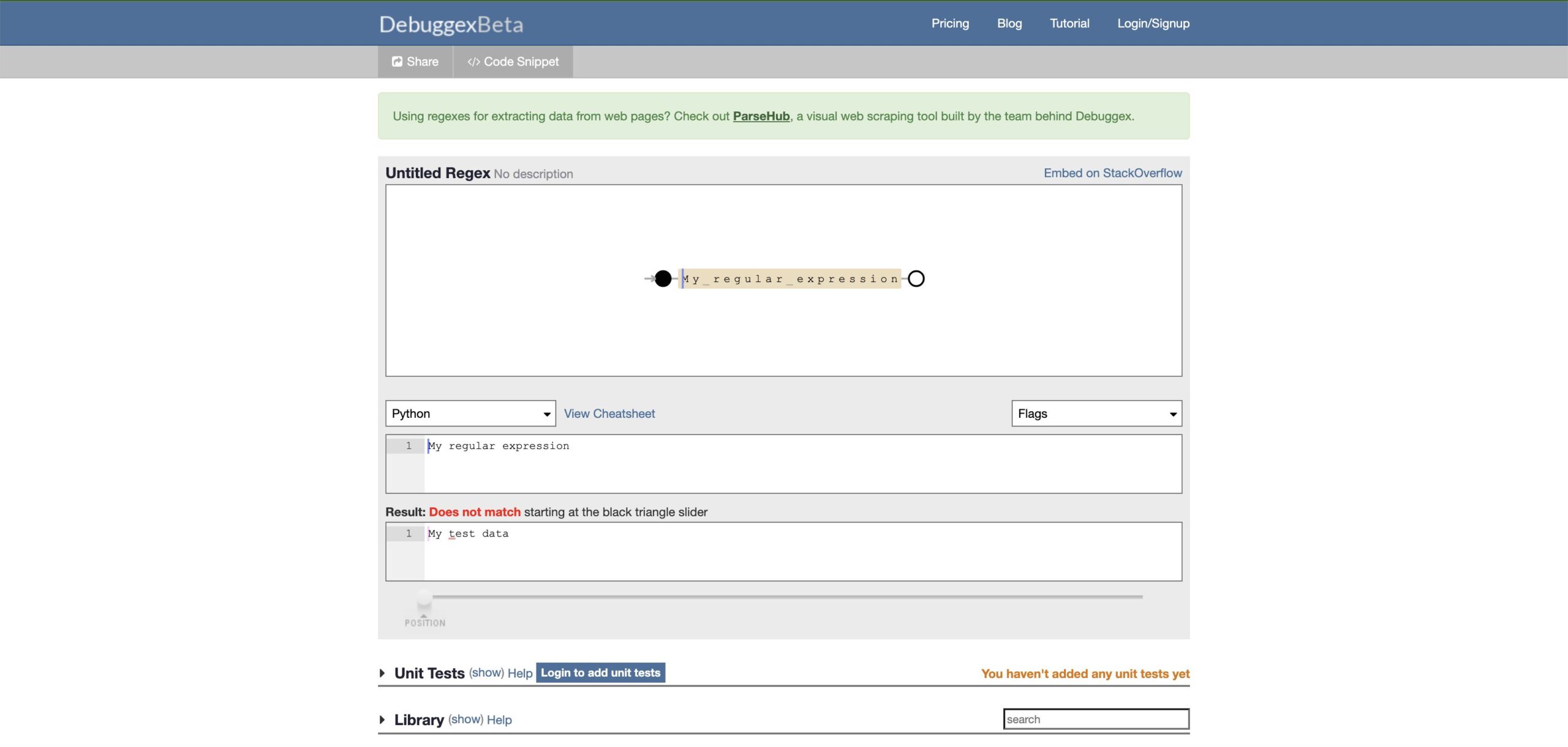 機能的にはregex101に劣りますが、正規表現の視覚化機能が優れておりわかりやすいです。