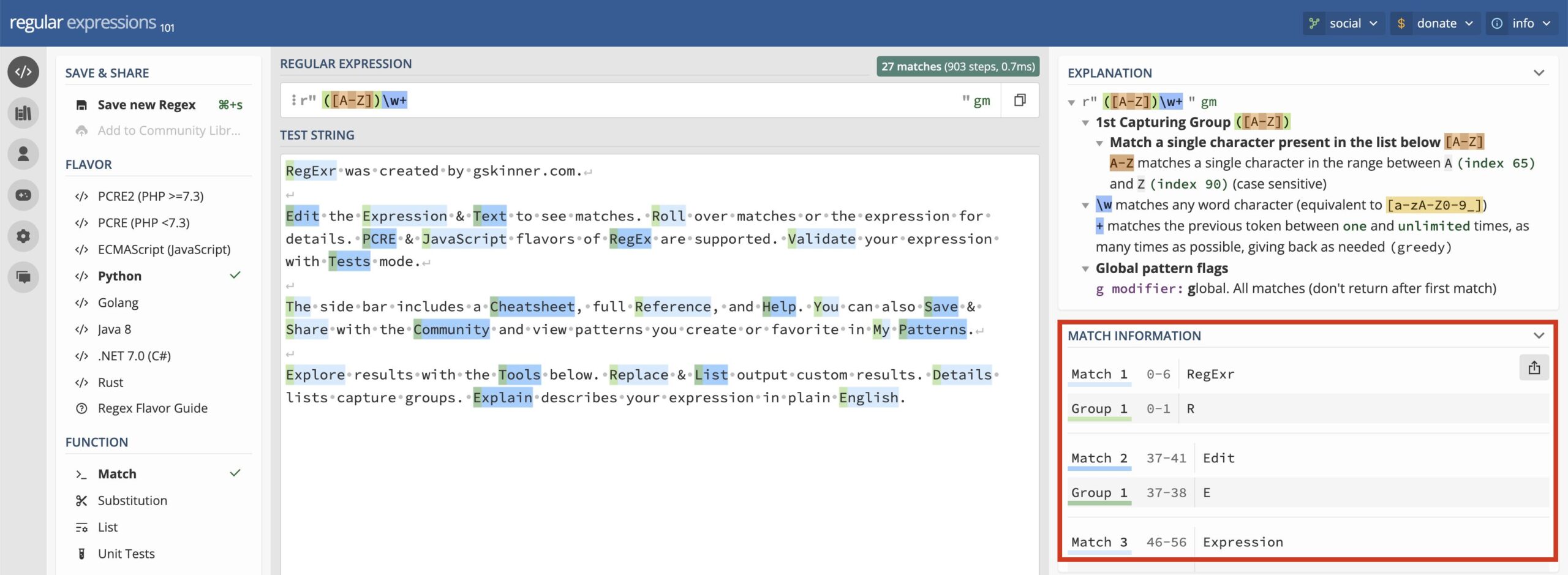 また、『MATCH INFORMATION』欄では正規表現にマッチした文字列(とグループ化していればその文字列)をリスト表示してくれます。